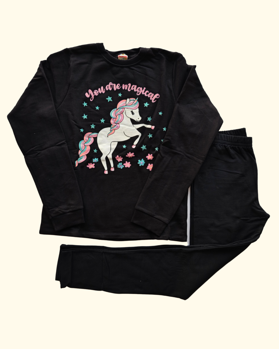 Este conjunto com blusão e calça legging apresenta uma estampa delicada de unicórnio, ideal para proporcionar conforto e estilo às crianças. Confeccionado com materiais macios e flexíveis, garante liberdade de movimento para o dia a dia, enquanto o design encantador estimula a imaginação. Perfeito para ocasiões casuais, combina praticidade e charme em uma peça versátil para o guarda-roupa infantil.