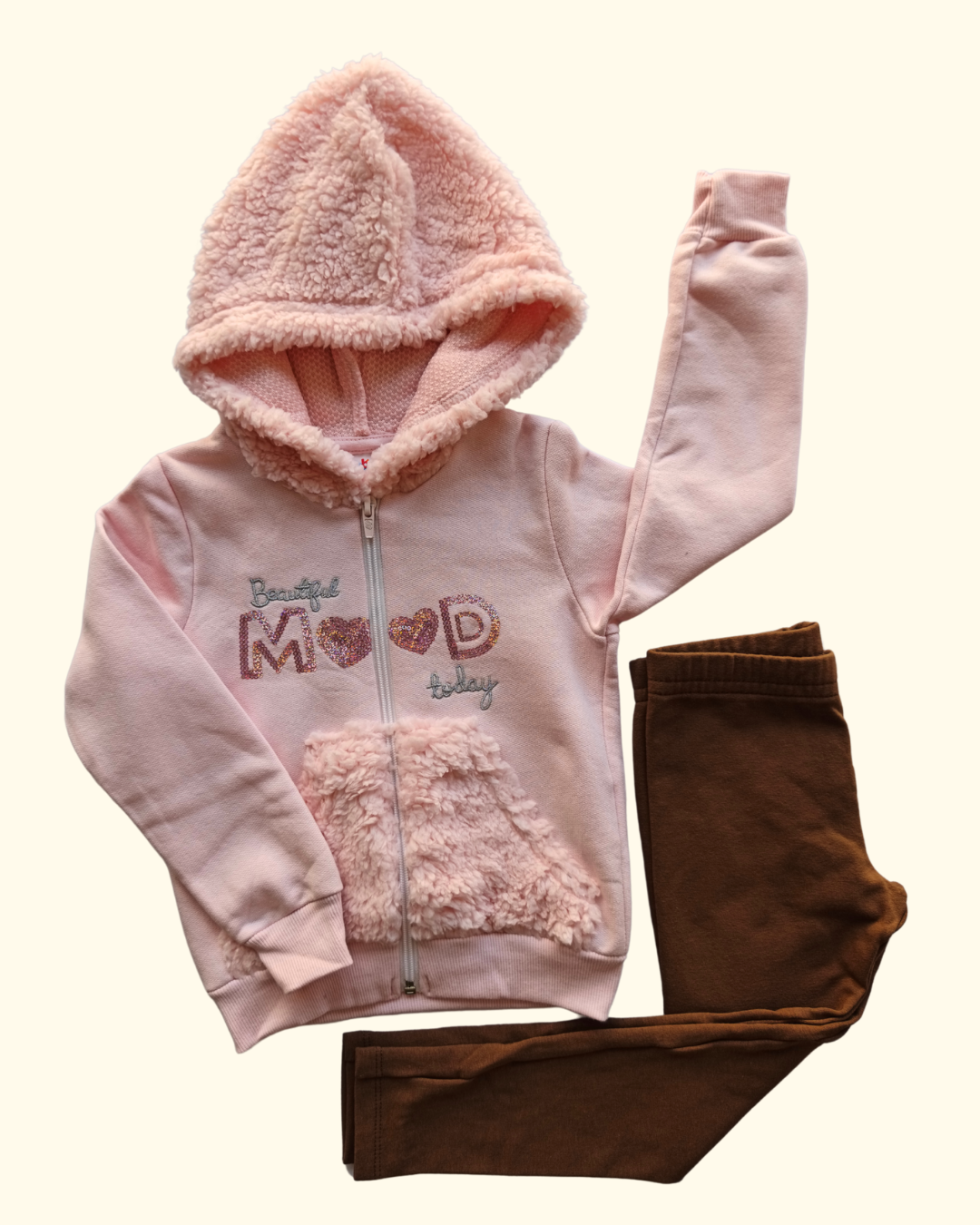 Este conjunto para meninas combina uma jaqueta com detalhes em pelinhos macio nos bolsos frontais e no capuz, e uma calça legging confortável, ideal para garantir aquecimento e liberdade de movimento. A jaqueta oferece toque aconchegante, perfeita para dias mais friozinhos, enquanto a legging flexível acompanha as atividades diárias com praticidade. Uma escolha versátil que une estilo e conforto para o dia a dia infantil.