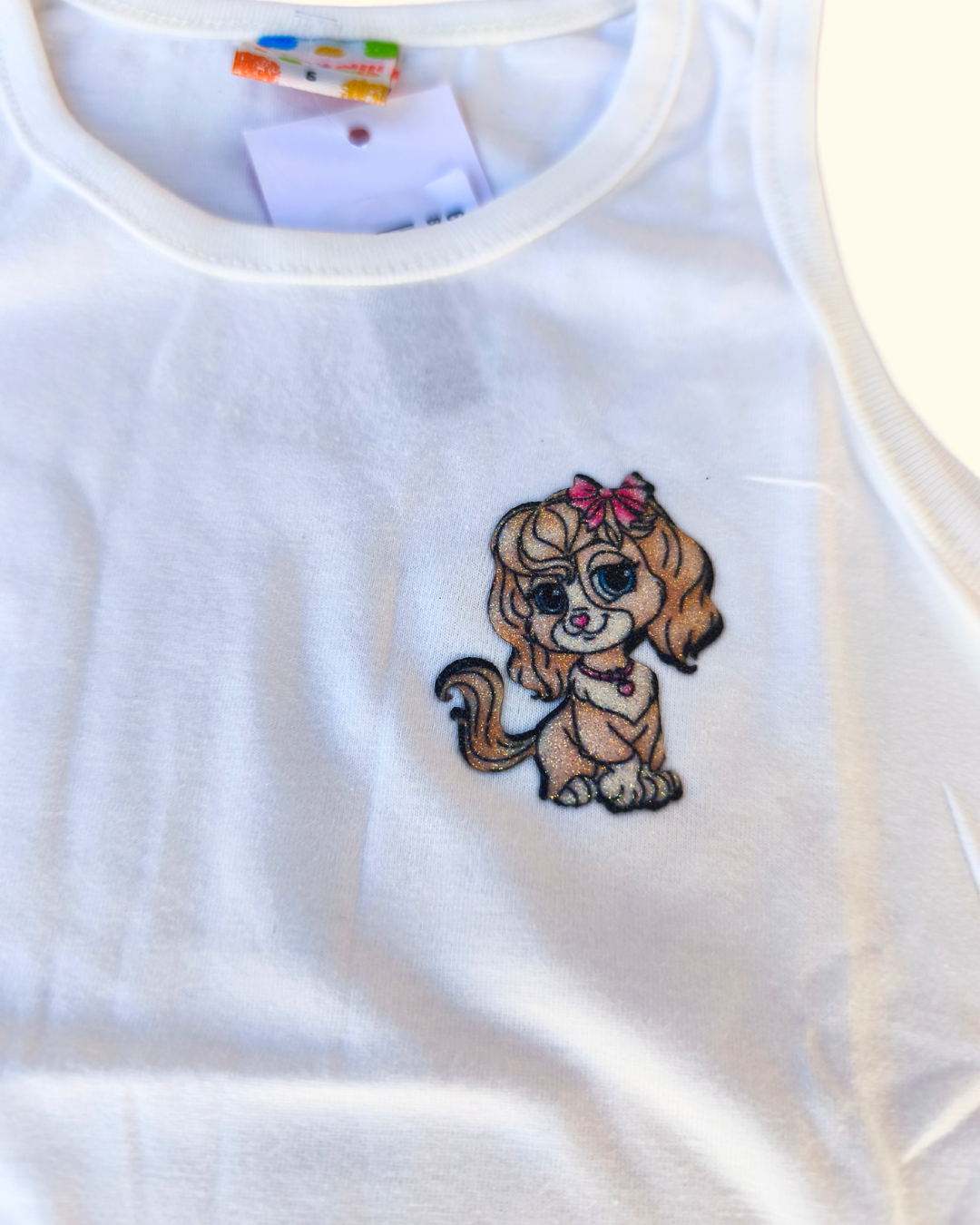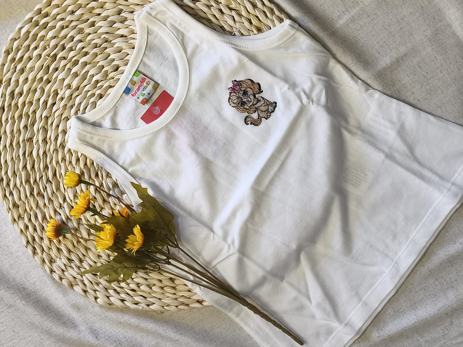 Esta regata apresenta um delicado aplique de cãozinho, que adiciona um toque de charme e personalidade à peça. Confeccionada com tecido leve e confortável, é ideal para o dia a dia, garantindo frescor e estilo. Perfeita para quem busca uma combinação de conforto e um detalhe diferenciado no visual.
